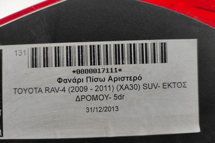 Φανάρι Πίσω Αριστερό για TOYOTA RAV-4 (2009 - 2011) (XA30) SUV- ΕΚΤΟΣ ΔΡΟΜΟΥ- 5dr