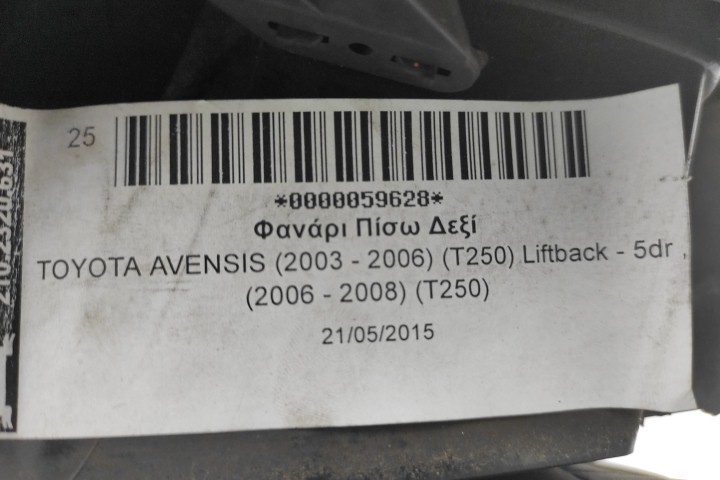 Φανάρι Πίσω Δεξί για TOYOTA AVENSIS (2003 - 2006) (T250) Liftback - 5dr , (2006 - 2008) (T250)