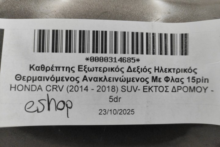 Καθρέπτης Εξωτερικός Δεξιός Ηλεκτρικός Θερμαινόμενος Ανακλεινώμενος Με Φλας 15pin για HONDA CRV (2014 - 2018) SUV- ΕΚΤΟΣ ΔΡΟΜΟΥ - 5dr