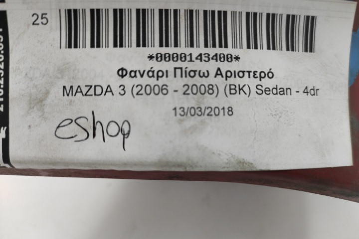 Φανάρι Πίσω Αριστερό για MAZDA 3 (2006 - 2008) (BK) Sedan - 4dr