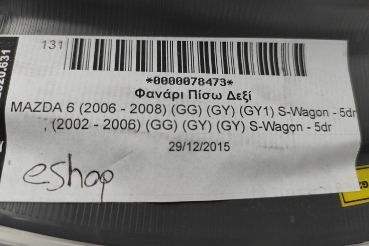 Φανάρι Πίσω Δεξί για MAZDA 6 (2006 - 2008) (GG) (GY) (GY1) S-Wagon - 5dr , (2002 - 2006) (GG) (GY) (GY) S-Wagon - 5dr