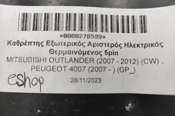 Καθρέπτης Εξωτερικός Αριστερός Ηλεκτρικός Θερμαινόμενος 5pin Με Ζημια Στο Καπακι για MITSUBISHI OUTLANDER (2007 - 2012) (CW) , PEUGEOT 4007 (2007 - ) (GP_)