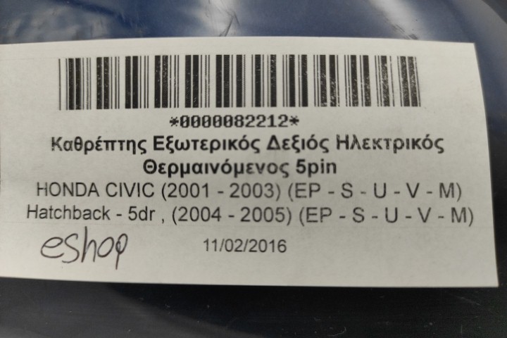 Καθρέπτης Εξωτερικός Δεξιός Ηλεκτρικός Θερμαινόμενος 5pin για HONDA CIVIC (2001 - 2003) (EP - S - U - V - M) Hatchback - 5dr , (2004 - 2005) (EP - S - U - V - M)